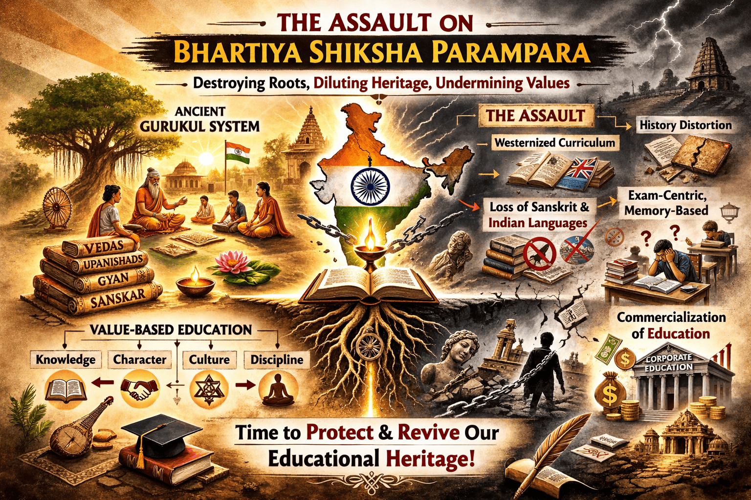 For centuries, Bharat’s education system was rooted in Gurukuls, pathshalas, and Sanskrit tols that emerged organically from society, dharma and community life. These institutions did not merely teach literacy; they transmitted values of dharma, nationhood, self‑respect and spiritual inquiry that defined Bhartiya civilisation. With the arrival of British rule and Christian missionary activity, this indigenous ecosystem was systematically sidelined in favour of a Western, church‑influenced, English‑medium system designed to create “brown sahibs” loyal to the Empire and alienated from their own culture.