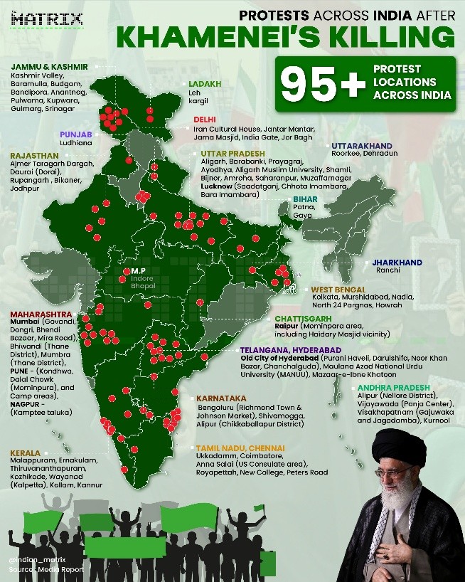 Recent events in India provide an illustrative example of how sectarian affiliations can shape political mobilisation. Following reports of the assassination of Iran’s Supreme Leader Ayatollah Ali Khamenei, demonstrations and mourning gatherings were organised across numerous cities in India. These protests occurred in more than ninety locations, including states such as Uttar Pradesh, Maharashtra, Telangana, Karnataka, Kerala, West Bengal, and Jammu & Kashmir.